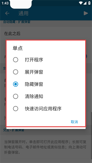 3、点击【单点】选项后,弹出红框标注的操作选择弹窗,可选择打开程序、展开弹窗、隐藏弹窗、清除通知、快速访问应用程序,点击【取消】。