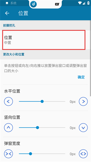 2、在【dynamicSpot-Pro】位置设置页,确认【前摄挖孔-位置】为【中置】,各项尺寸参数设为【0px】后点【确定】。