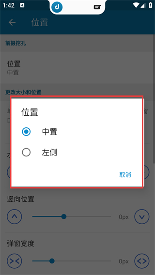 3、点击【前摄挖孔-位置】弹出选择框,默认选中【中置】,可切换为【左侧】。