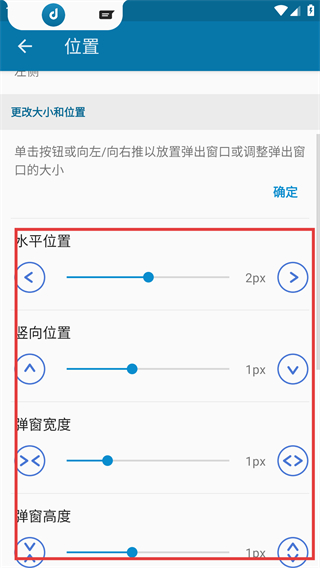 4、在位置设置页,拖动滑块调整【水平位置-2px】【竖向位置-1px】等参数,调整后点击【确定】保存。