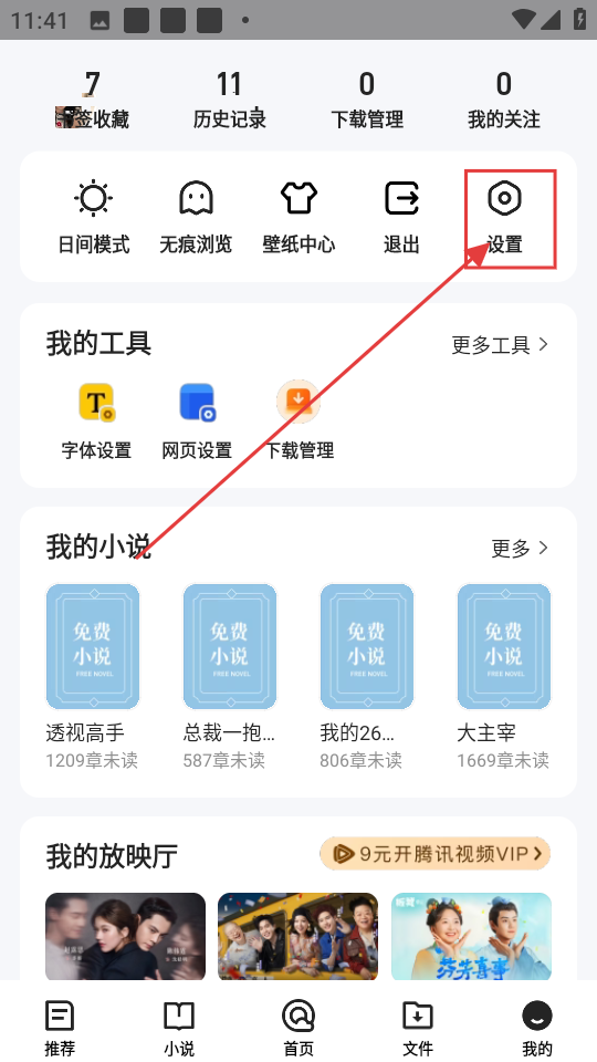 1、进入【我的】页面后,先看看各项功能,然后点击【设置】选项,开启后续的字体设置操作吧。