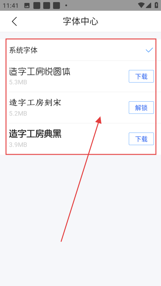 4、进入【字体中心】,这里有多种字体可选,像【造字工房悦圆体】【造字工房刻宋】等,根据喜好选择下载或解锁就行啦。