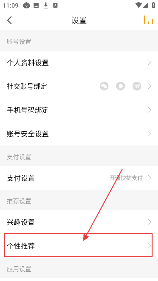 3、在设置页面,有账号设置、支付设置等选项,点击【个性推荐】,就能进入个性推荐设置页面呢。
