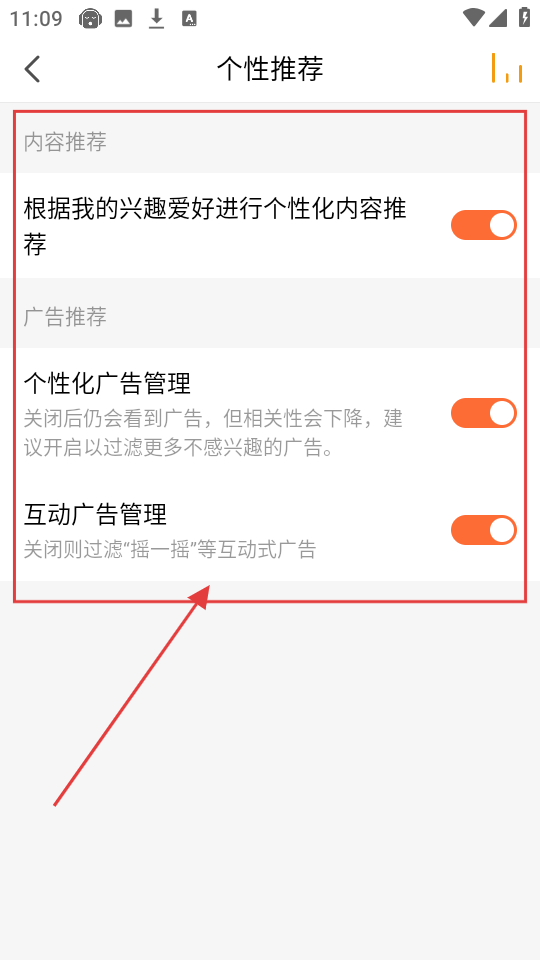 4、到了个性推荐设置页面,能看到内容推荐、广告推荐等相关设置,根据需求开启或关闭相应功能啦。