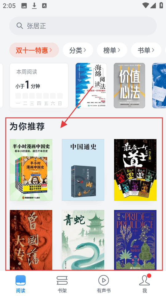 1、在阅读页面,可浏览为你推荐的书籍,找到感兴趣的书籍啦。