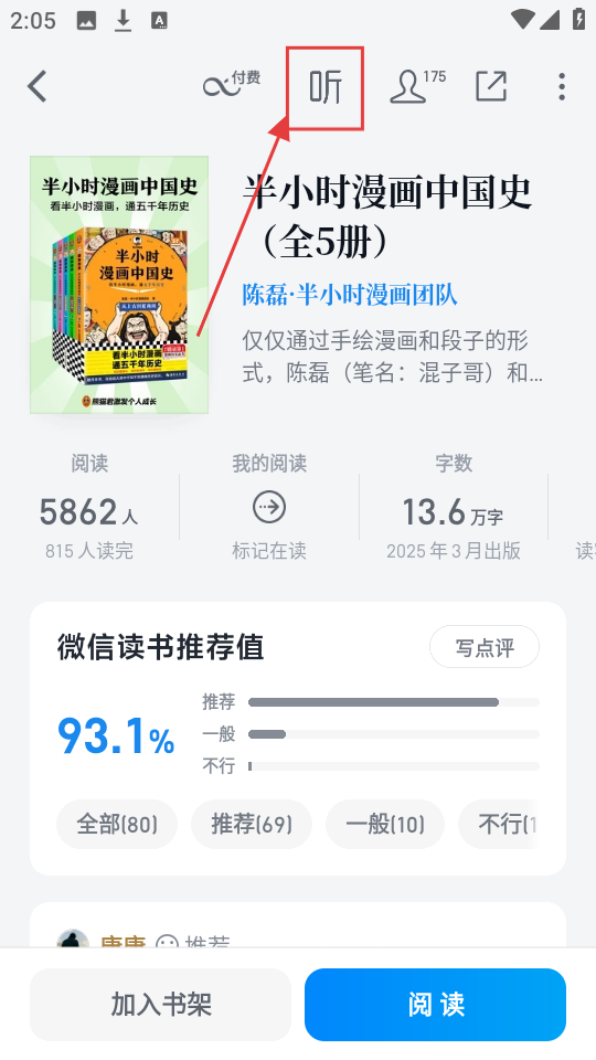 2、进入书籍详情页后,点击【听】,可进入有声书播放页面哦。