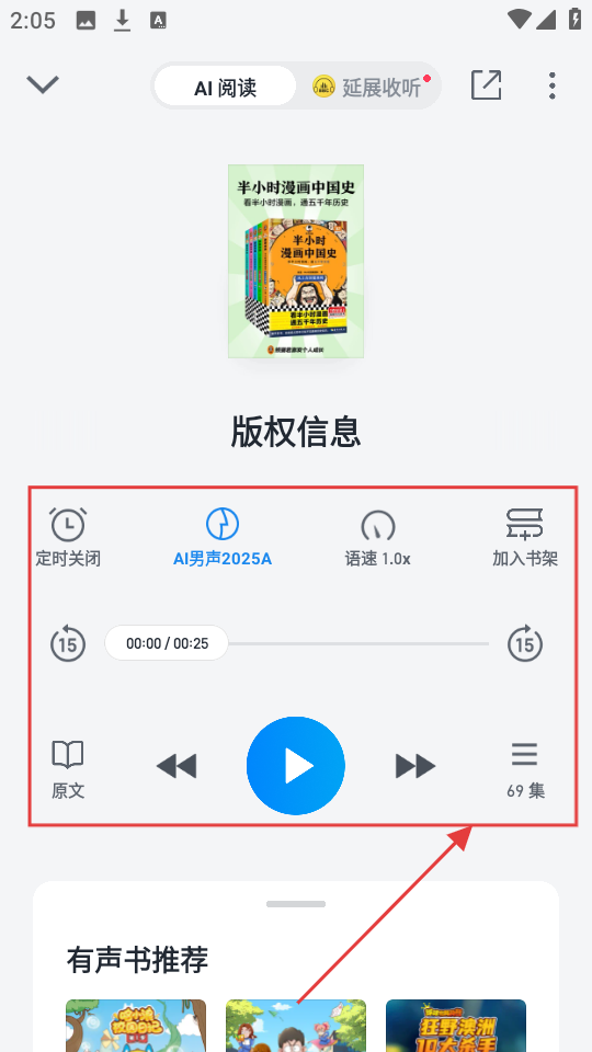 3、在有声书播放页面,可设置定时关闭、语速等,还能查看集数啦。