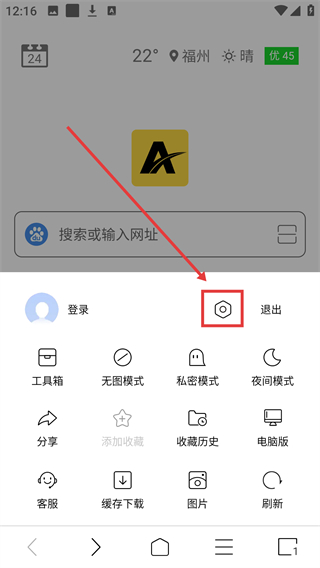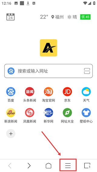 1、在浏览器首页,点击底部的菜单按钮,展开功能选项列表,可查看各类工具及设置入口啦。