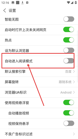 3、进入设置页面后,找到【自动进入阅读模式】选项,它当前处于关闭状态,准备开启该功能呀。