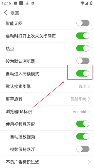 4、点击【自动进入阅读模式】对应的开关,将其切换为开启状态,即可启用该功能优化阅读体验啦。