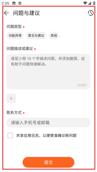 3、在问题与建议页,选择问题类型、填写描述和联系方式,就能准备提交反馈内容啦。
