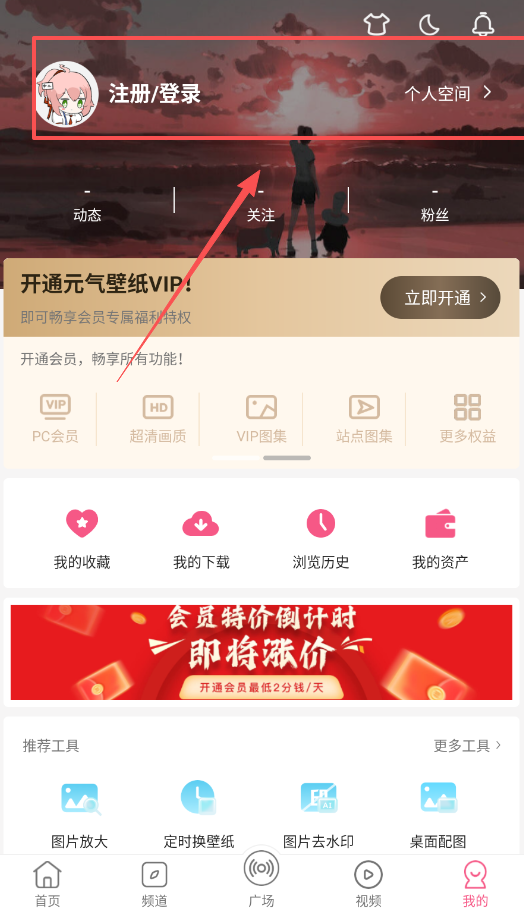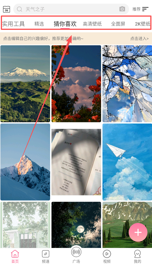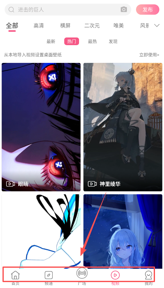 2、找壁纸最直接的方法是使用底部的频道和广场入口,这里内容更新很频繁,效率很高。