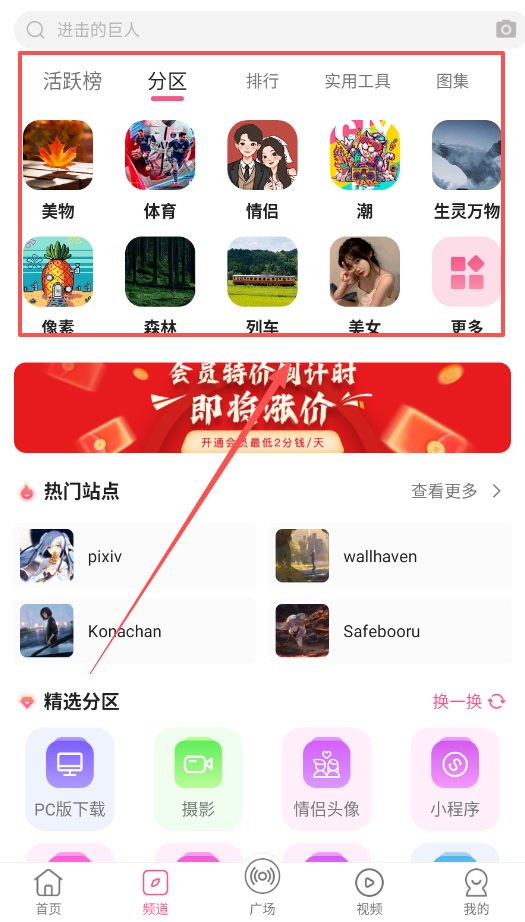 3、寻找热门资源可以进入活跃榜,这里按排行、美物、像素等分区展示了大量壁纸,找图更方便。