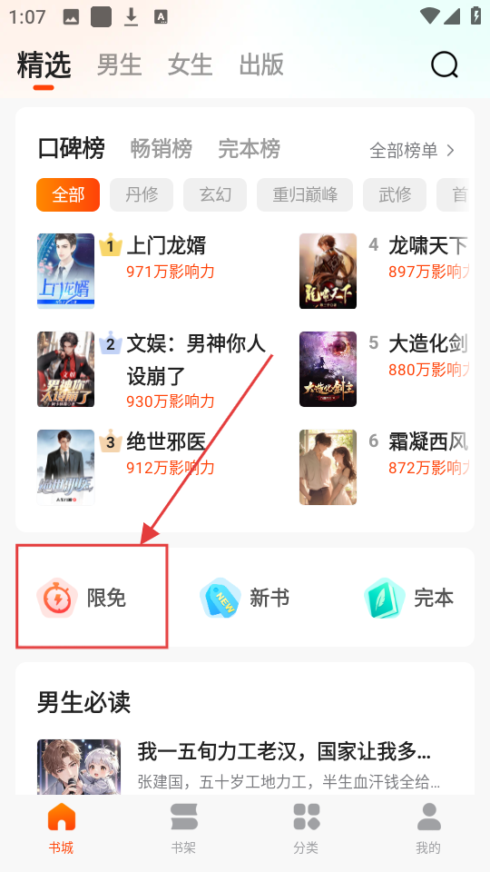 1、在书城页面找到【限免】选项并点击,进入后可查看限时免费的小说啦。