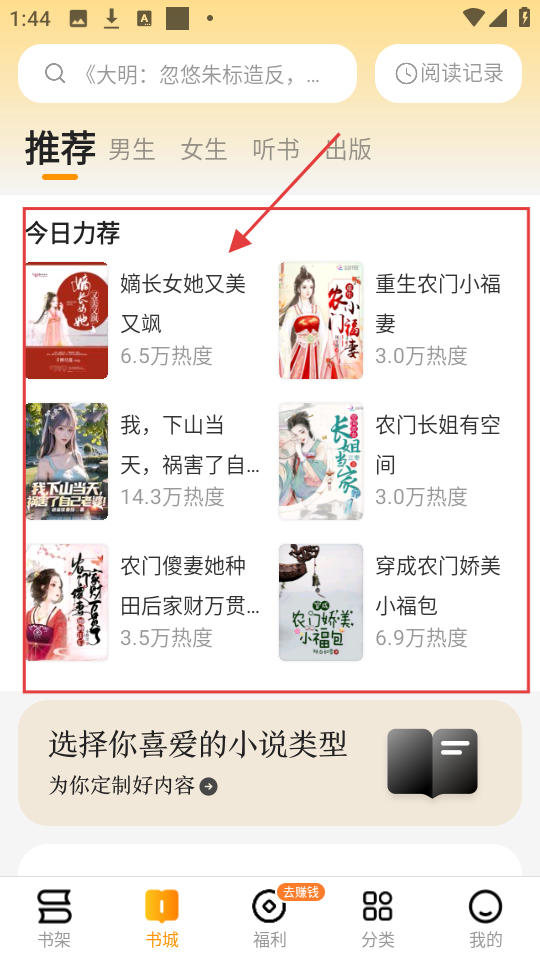 1、在书城推荐界面挑选喜欢的小说,如【嫡长女她又美又飒】,点击即可进入阅读哦。