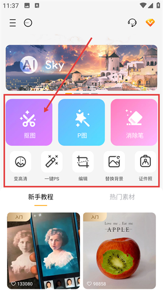 1、在主界面点【抠图】选项,能进入抠图编辑页面,后续可使用智能抠图等功能处理素材啦。