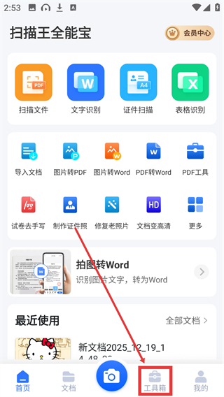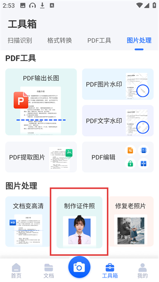 1、在扫描王全能宝首页点底部的【工具箱】选项,能进入工具集合界面,后续可找到证件照功能啦。