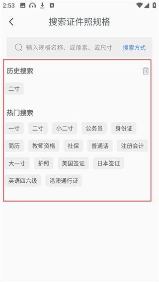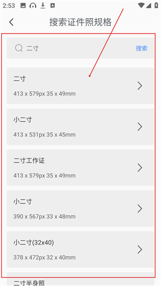 4、搜索“二寸”后会出现对应规格列表,点第一个【二寸】选项,就能进入该规格的证件照制作啦。