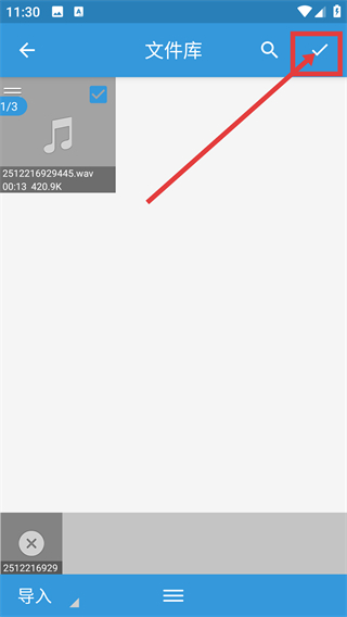 2、进入文件库页面后,选择要转换的音频文件,再点击右上角的确认按钮,就能进入导出格式选择页哦。