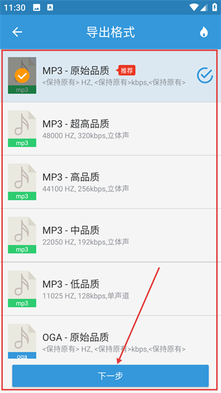 3、在导出格式页选择想要的音频品质,比如【MP3-原始品质】,选好后点击【下一步】就能开始转换啦。