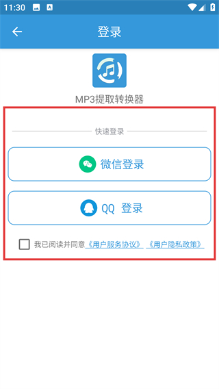 4、使用功能前需登录,在登录页勾选协议后,可选【微信登录】或【QQ登录】快速完成账号登录操作哦。