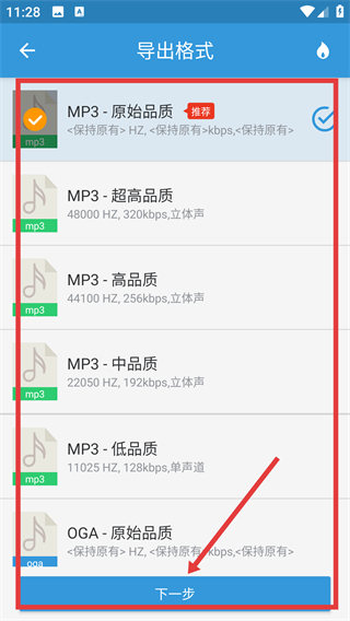 2、进入导出格式页面后,选择心仪的音频品质(如【MP3-原始品质】),再点【下一步】继续处理哦。