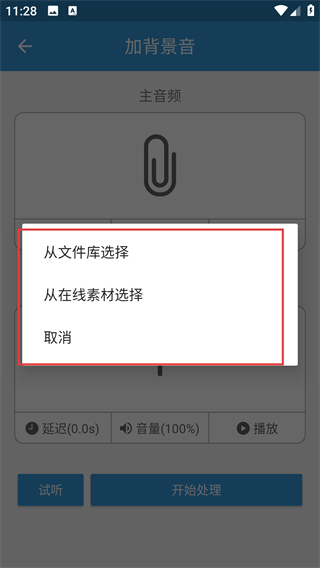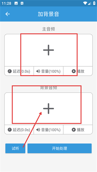 3、在加背景音页面,可分别添加主音频和背景音频,还能调整延迟、音量参数,让效果更贴合需求呀。