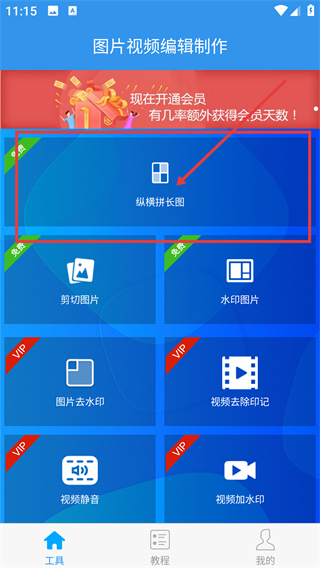 1、在工具页面点击【纵横拼长图】选项,就能进入拼长图的编辑页面,准备拼接多张图片啦。