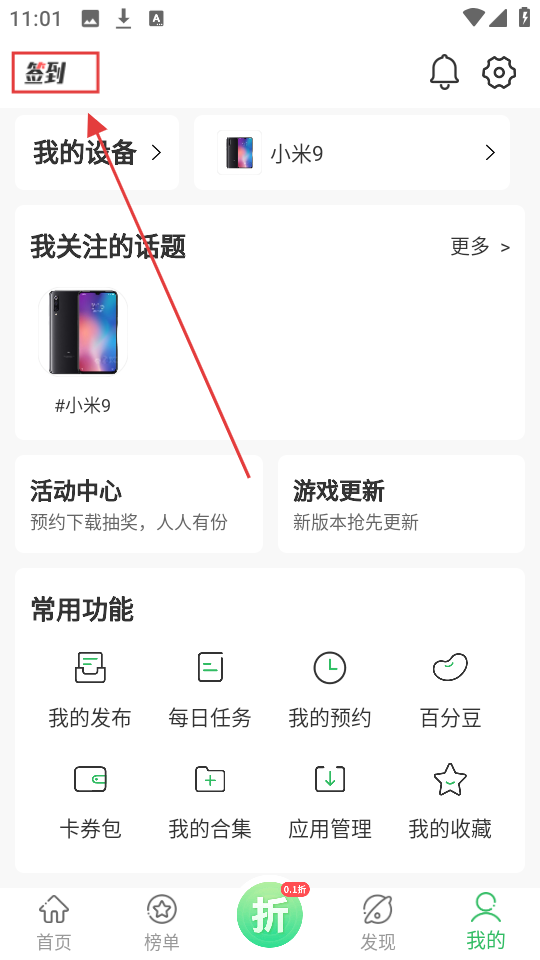 2、进入个人页面后,点击【签到】,可进入签到页面,参与签到领奖励哦。