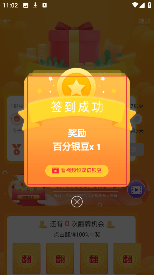 4、签到成功后,会弹出【签到成功】提示,显示获得的奖励,如百分银豆x1等哦。