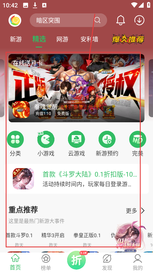 1、首页精选板块有不少好游戏,像【拳魂觉醒】0.1折很划算,快看看吧。