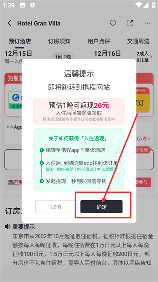 4、在温馨提示弹窗里点击【确定】按钮,就能跳转到携程网站,继续完成酒店的预订操作啦。