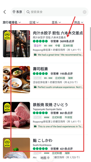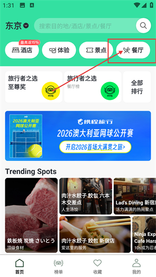 1、在首页点【餐厅】选项,能进入东京的餐厅列表页面,后续可浏览各类美食店铺并准备预定啦。