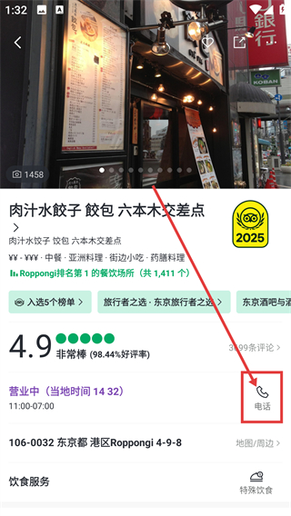 3、进入餐厅详情页后,点右侧【电话】按钮,就能唤起联络餐厅的界面,可通过电话进行预定啦。