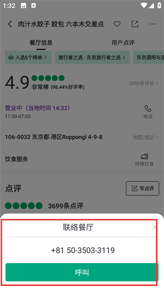 4、在联络餐厅界面能看到餐厅电话,点【呼叫】按钮拨打,就能和餐厅沟通预定相关事宜啦。