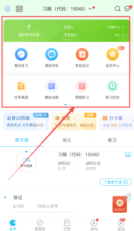2、在首页找到我的学习计划,可以参加每日练习里的薄弱专练,或者做做历年真题,还能查看自己的学习进度和总学时。