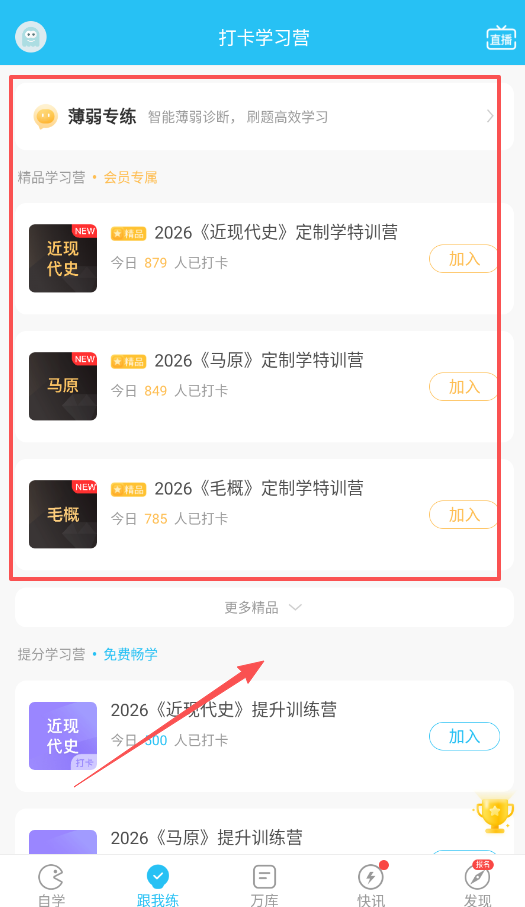 3、想针对性提升的话,就去打卡学习营,选近现代史、马原或毛概的定制学特训营加入,能智能诊断薄弱点让刷题更高效。