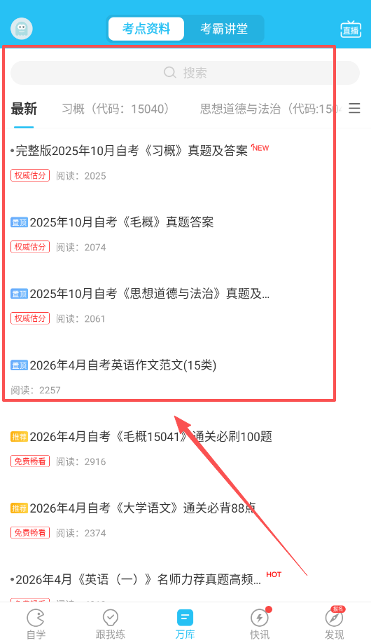 4、考点资料里搜索最新真题和备考资料,比如2025年10月自考习惯真题或2026年4月毛概通关必刷题,免费资料直接看。