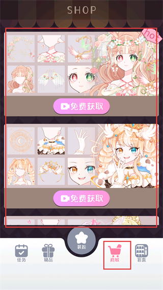 4、返回底部的【商城】页面,选择心仪的装扮套装,点击【免费获取】即可为形象解锁新装饰啦。