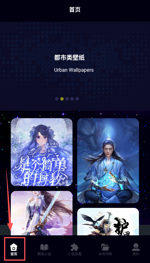 1、从首页进入,你可以看到“仙侠类壁纸”等精美资源,导航栏清晰地排列着首页、精品小说、小说拼图、本地书库。