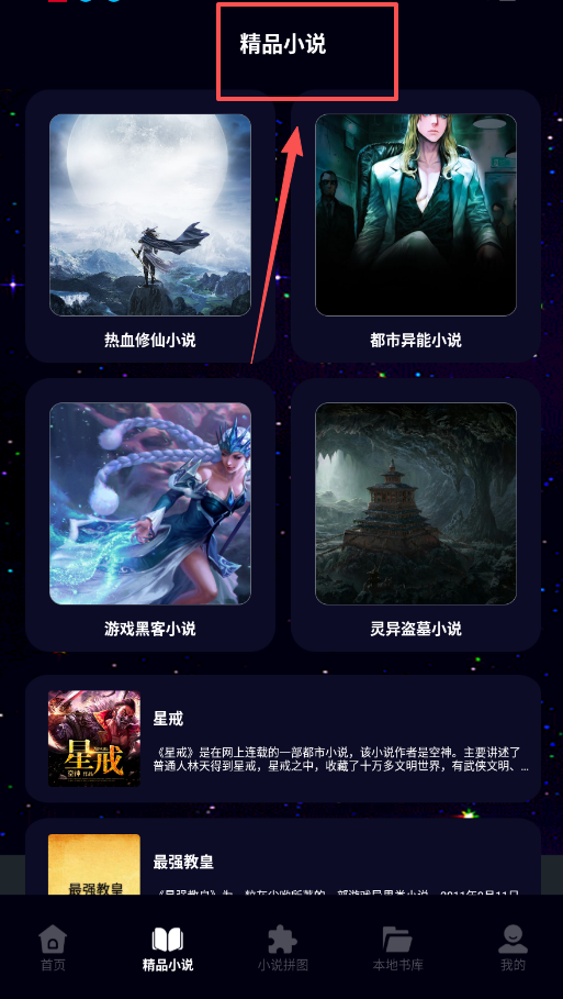 2、寻找新书时,请点击“精品小说”,这里将作品细分为热血修仙、都市异能等类别,浏览时直接点击如“星戒”这样的书名。