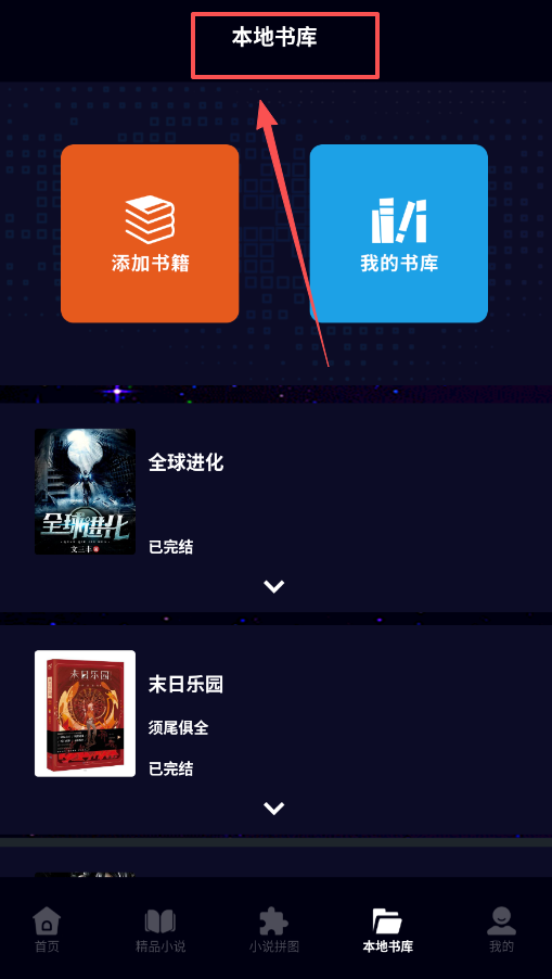 3、如果你有自己的电子书,可以前往“本地书库”进行管理,使用“添加书籍”功能导入文件,软件会像整理“全球进化”一样。