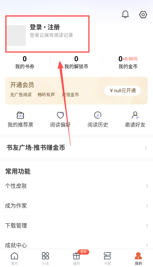 1、登录注册后,在“我的”页面能查看书券、解锁币和金币,开通会员可享无广告、畅听等权益。