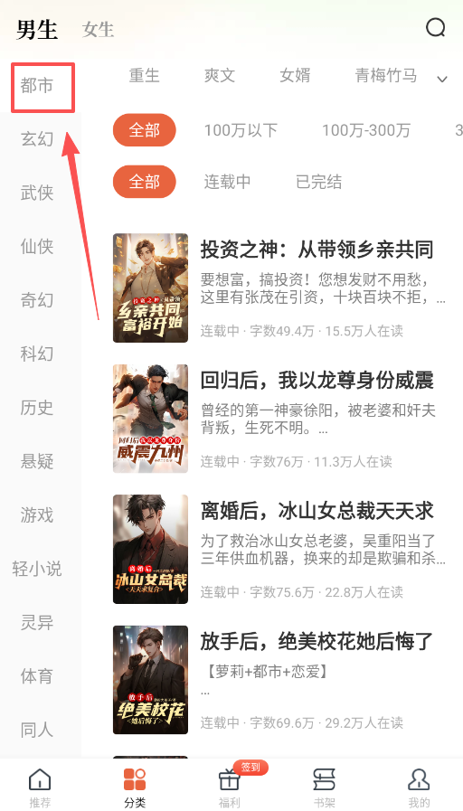 3、在“分类”页,可按男生女生、题材、字数、状态筛选,比如选“都市、连载中”,就能高效找到像最强神豪系统这类热门连载书。