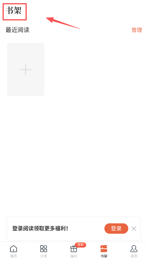4、在“书架”页,“最近阅读”会记录你的阅读进度,记得先登录以同步记录和领取福利,点击“管理”可整理你的收藏书籍。