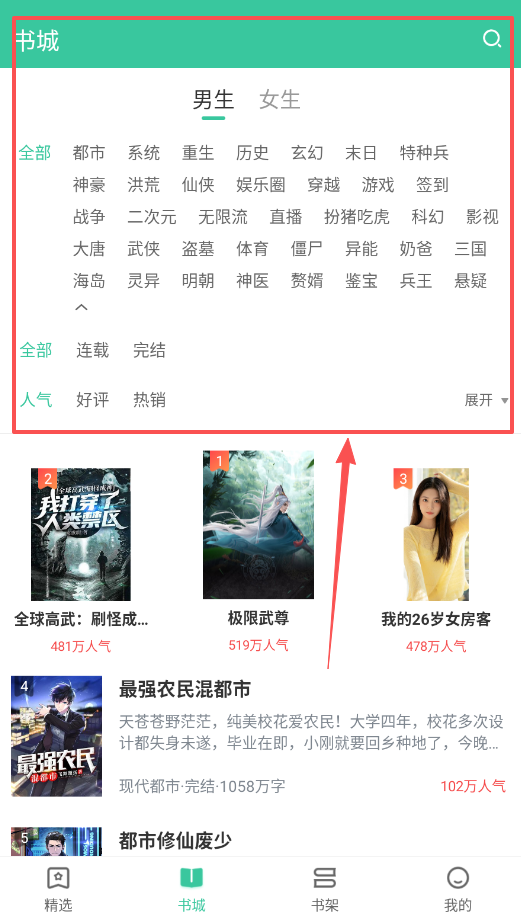 3、书城页提供了详细的筛选方式,先选男生或女生,再用各种题材标签比如重生、仙侠来过滤,每本书都附有简短介绍供参考。