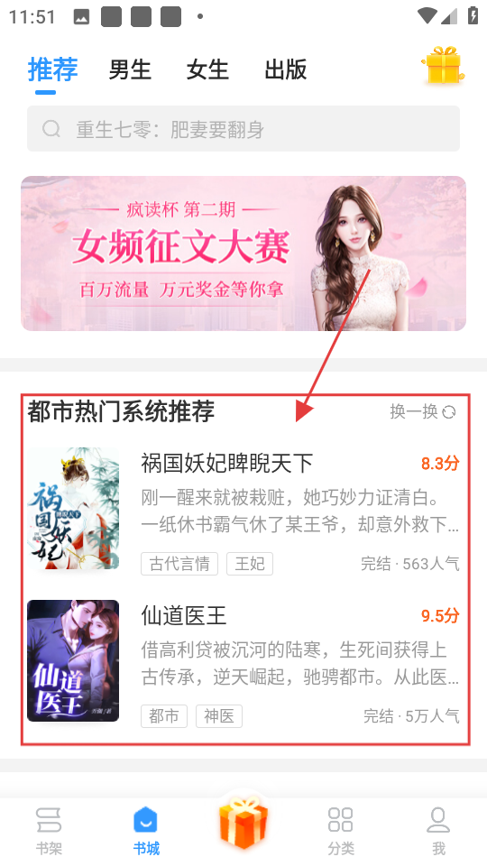 1、在书城都市热门系统推荐板块找到《祸国妖妃睥睨天下》,点击进入书籍详情页哦。