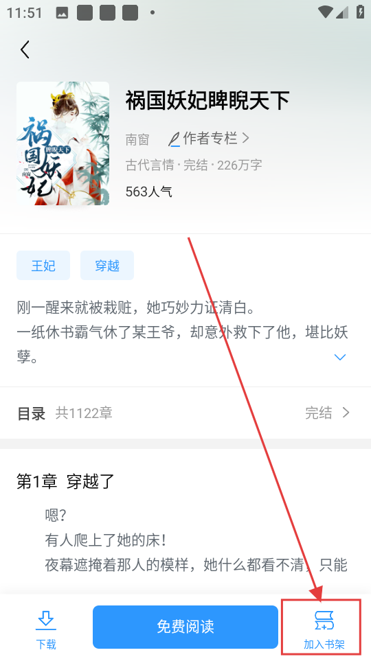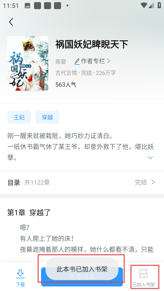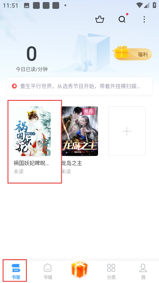 4、点击【书架】,就能看到添加的《祸国妖妃睥睨天下》,快速进入阅读啦。