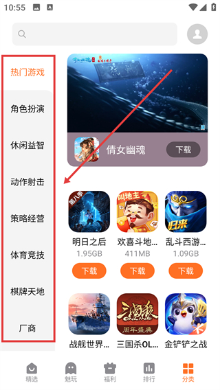 1、在应用的精选页面,点击底部的【分类】选项,就能进入游戏分类专区,找到不同类型的游戏啦。