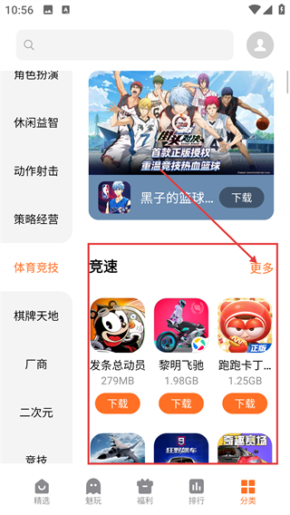 3、切换到【体育竞技】分类后,找到【竞速】板块并点击【更多】,就能查看该类别的全部游戏啦。